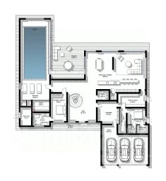 вход в дом из гаража через гардеробную с доступом также в черновую кухню, зону персонала, а также в сам дом, доступ в блок персонала с улицы с ограниченным доступом персонала в зону хозяев, во входной зоне - второй свет, спальня-кабинет со своим с/у, SPA-зона с бассейном, сауной и хамамом, комната отдыха. Гараж в контуре дома на 3 автомобиля.