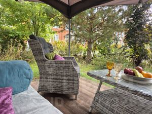 -таунхаус выходит на парковую зону с большим количеством зелёных насаждений и скамейками для расслабляющего отдыха;