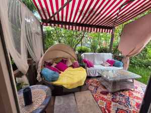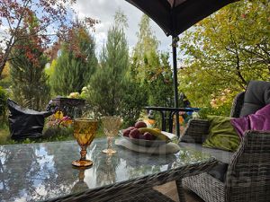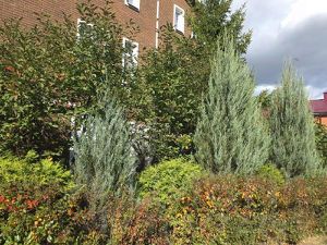 - самые крупные можжевельники в посёлке; декоративная яблоня Жизель, цветение которой в мае напоминает цветы сакуры; большие вишни, выполняющие с мая по сентябрь роль живой изгороди для открытой террасы с красивой большой круглой кроватью из ротанга и др.
