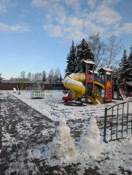 Круглогодичный подъезд, асфальтированная дорога, рядом с домом пруд, детская площадка, остановка общественного транспорта.