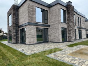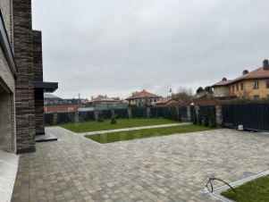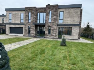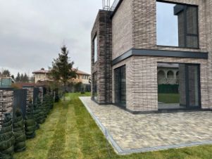 На территории организована мангальная зона, по всему участку проведен автополив, постелен рулонный газон, по всему периметру рассажены туи.