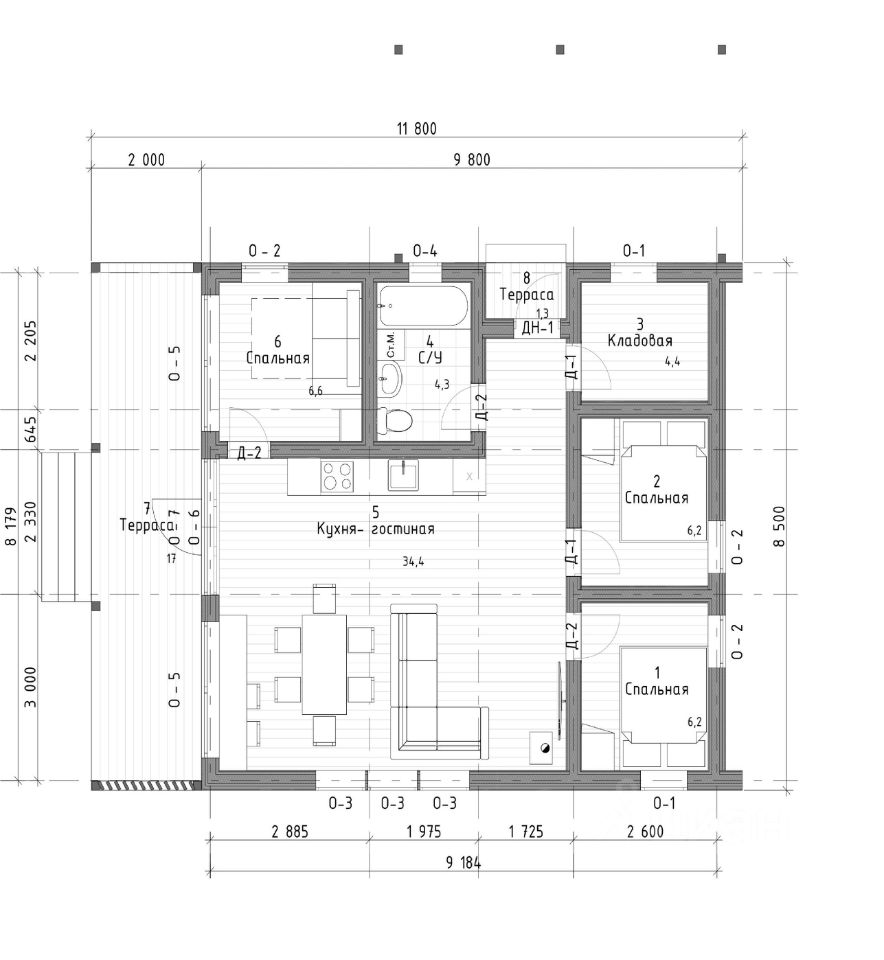 - Состоит из кухни-гостиной 36,15 кв.м., 3-х комнат (6,88 - 6,88 - 7,28 кв.м.), кладовки 4,95 кв.м., совмещенного санузла 4,91 кв.м., двух террас 17,47 и 1,42 кв.м., навеса 20 кв.м. (план дома см.фото)