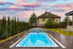 Участок 15 соток, ровный, огорожен забором на бетонном основании, установлены автоматические ворота, дорожки и парковка вымощены брусчаткой.