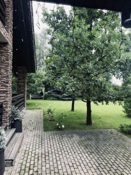 Участок органично дополняет концепцию шале. Ухоженный ландшафт с взрослыми соснами, пышными гортензиями и уютными террасами создает ощущение единения с природой. Есть даже своя маленькая ферма — кусты голубики и крыжовника. Парковка: гараж на 2 авто + навес в том же стиле еще на 2.