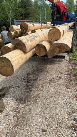 На участке недостроенный дом из сруба в диком стиле (диаметр ~26-38, зимний лес, собран в мае 2025), крыша металлочерепица цвет терракот, водосточная система, обсада, небольшой проект от дизайнера(отдам при необходимости), утепленная бытовка для проживания строителей, свет, есть бревна под беседку.