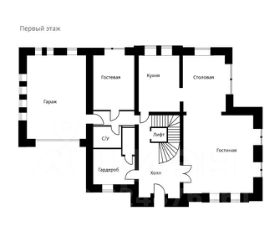 1 этаж: просторная гостиная с выходом на террасу, кухня-столовая, большая гардеробная.
