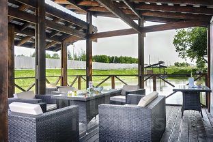 -кухня-столовая с выходом прямо на большую террасу, где удобно может расположиться гриль и стол, что позволит не строить -лишних беседок на участке;
