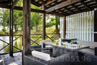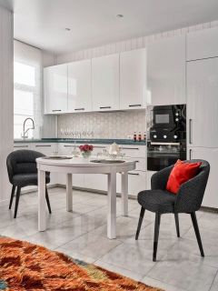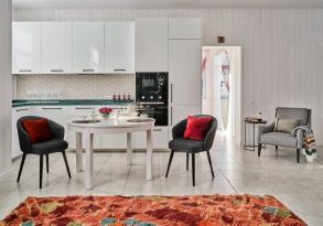 -кухня-столовая с выходом прямо на большую террасу, где удобно может расположиться гриль и стол, что позволит не строить лишних беседок на участке;