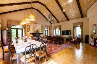 Площадь дома составляет 362.5 м, расположен на участке площадью 43 сотки. Особенность расположения - природа вокруг, чистый воздух и прекрасная возможность насладиться прелестями подмосковного пригорода благодаря близкому соседству леса.
