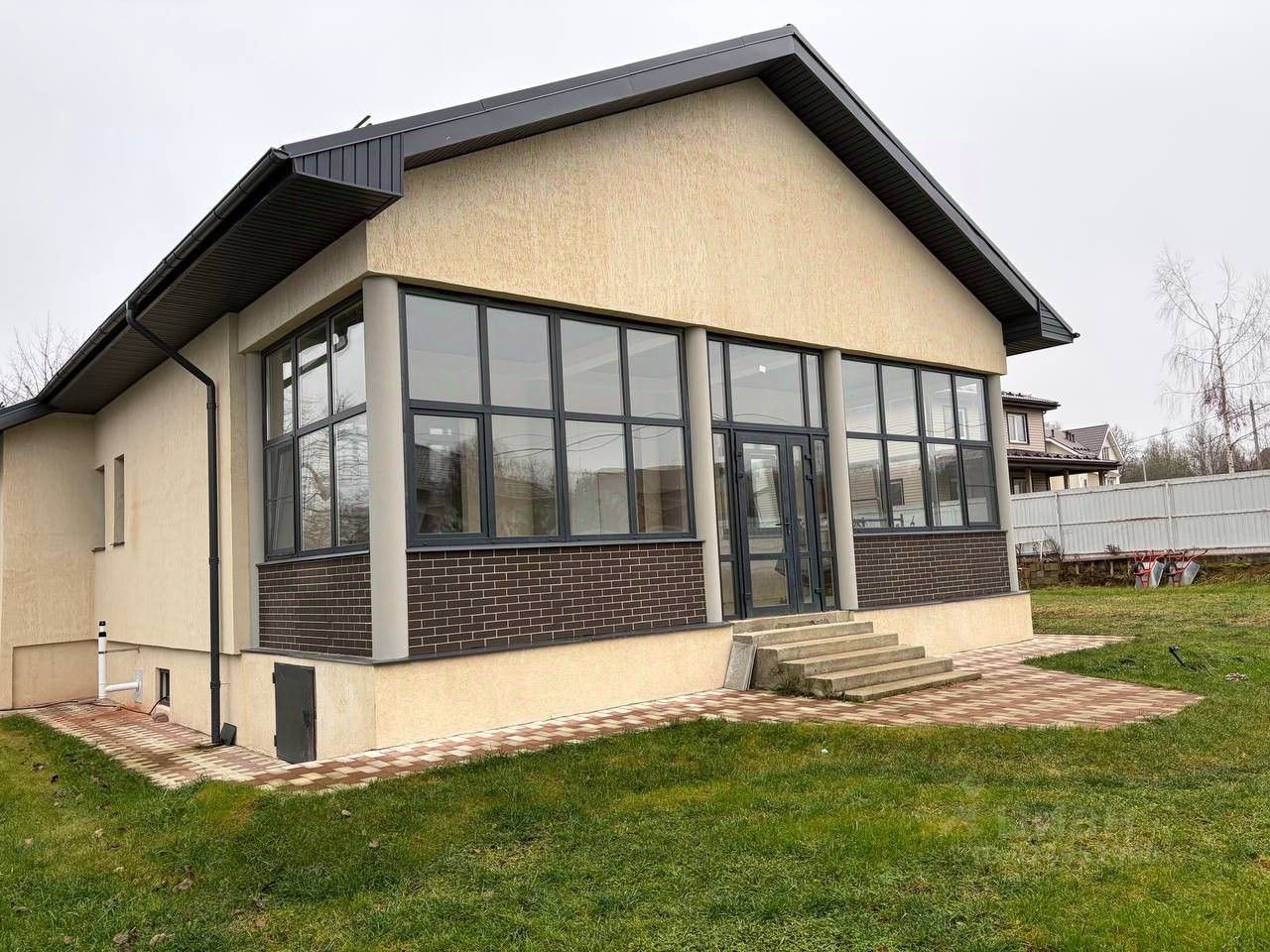 Планировка дома продумана для удобного постоянного проживания. На первом этаже расположена большая светлая гостиная и две комнаты. Цокольный этаж включает три помещения и котельную, что позволяет использовать пространство в качестве спортзала, мастерской, дополнительных спален или помещений для хранения. Просторная веранда с выходом в сад создаёт уютную зону отдыха для всей семьи.