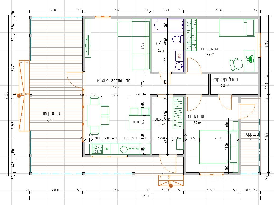 - Кухня-гостиная: Полностью оборудована современной техникой посудомоечной машиной, встроенным холодильником и духовкой.