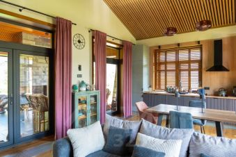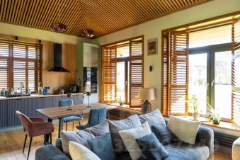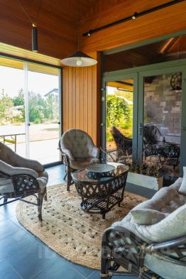 Панорамное остекление стирает границы и создает тесное взаимодействие внутреннего пространств и окружающего ландшафта.