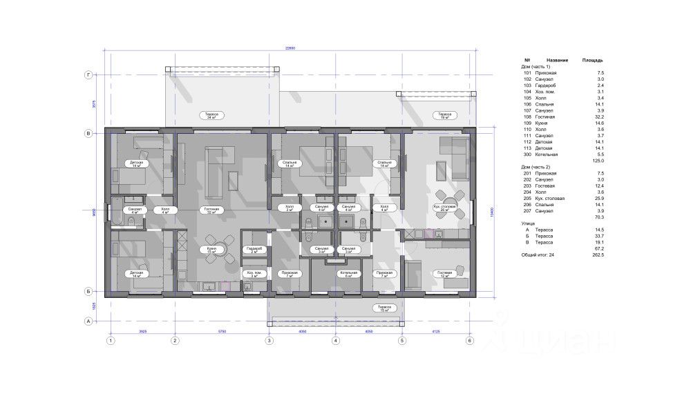 - Большая часть дома площадью 125 квадратных метров включает три уютные спальни, три полноценных санузла, шикарную кухню-гостиную с выходящей на террасу, отдельный холл с гардеробом, помещение под прачечную и даже специальный трап с душем для чистки обуви и лап ваших питомцев.