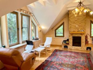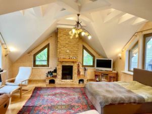 В доме санузел, большая гостиная с панорамными окнами и камином, кабинет, кухня-гостинная.