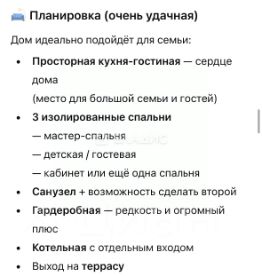 Кирпичный дом с утеплениемВысота потолков 3,3 мТёплый пол по всему дому, кроме спаленПанорамные окнаПродуманная семейная планировкаКачественная инженерия и электрика