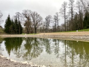 Пруд с пляжем: Летний отдых станет еще приятнее благодаря собственному пруду с небольшим пляжем, где можно освежиться в жаркий день.