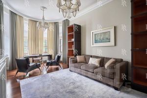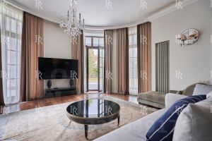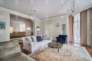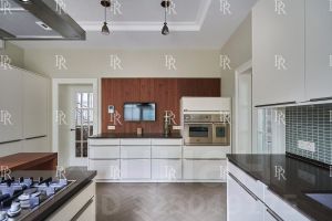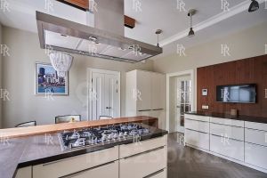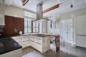 Кухня укомплектована всей необходимой бытовой техникой итальянских, немецких производителей газовая варочная панель Ilve, вытяжка Ilve, два духовых шкафа Ilve, посудомоечная машина Neff, встроенный холодильник Liebherr. Большой обеденный стол, комфортные стулья, уютные кресла и диваны известных американских дизайнеров (Baker, Ralph Lauren) создают уютную и комфортную атмосферу для отдыха.