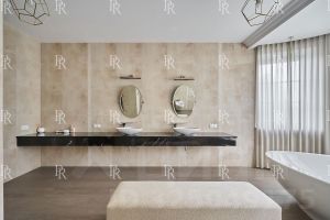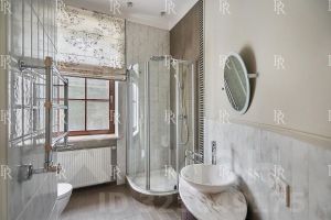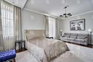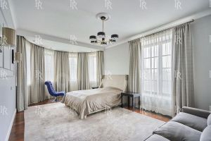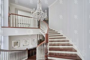 Просторный и светлый интерьер особняка создан в стиле современной классики, идеальным дополнением которого стали постеры Ralph Lauren, шторы Hermes. Лестница выполнена на заказ с резными балясинами, на полу во всех комнатах американский орех. Гармонично вписываются и украшают интерьер люстры американского и французского производства, выполненные на заказ специально для этого дома, мягкое свечение которых создаёт особую эстетику и уют. Отделка санузлов выполнена из материалов премиального качества европейских производителей, сантехника Villeroy & Boch.