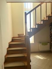 На второй этаж ведет правильно расположенная качественная деревянная лестница.