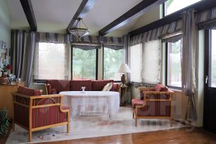 Снаружи две просторные террасы, с выдвижными навесами от солнца. Четыре спальни (одна с гардеробной), две гостиные комнаты, кухня с камином, два санузла и технической помещение с электрическим бойлером, водоочисткой, хозяйственной раковиной, стиральной машиной и местом для хранения. На первом этаже - тёплый пол на кухне и в санузле. Помимо дома есть гараж и действующая баня с санузлом и гостевой комнатой. Соседи с двух сторон.