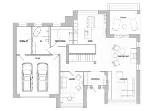 - 1 этаж - прихожая, холл, спальня-кабинет, гараж на 2 машиноместа, котельная, санузел, прачечная, терраса, кухня, гостиная со вторым светом, лестница,
