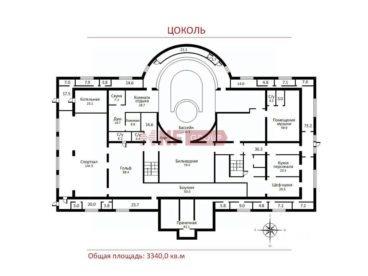 Цоколь: 1315.2 кв м ( 7 с/у) Бассейн, Бильярдная, Гольф, Боулинг, Кондиционерная, Помещение охраны, Спортзал, С/у персонала, Сауна, Комната отдыха , Душевая , Хамам, Парикмахерская, Массажная/Бар, Комната звукозаписи, Кинотеатр, Помещение музыки, Кладовая, Мойка (кухня), Шеф-кухня, Комнаты персонала, Прачечная/Гладильная, Склад, Электрощитовые, Бойлерная;