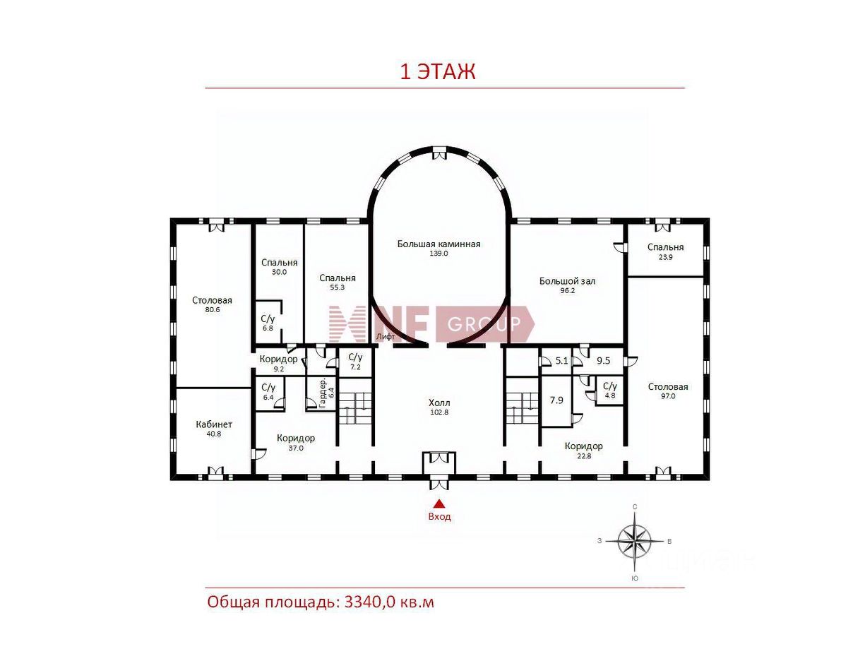 1-й этаж: 856.3 кв м ( 3 спальни, 5 с/у) Тамбур, Холл большой 100 кв м, Большая каминная 139 кв м, Туалет гостевой, Гардероб гостевой и хозяйский, Кабинет 40 кв м, Столовая 80 кв м, Гостевая спальня 30 кв м, Гостевая спальня 55 кв м, Большой зал 96 кв м, Спальня 23,91 Столовая 97 кв м, Гардероб;
