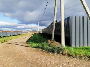 Вторая линия от леса, не проездная тихая дорога, трехметровый забор (профлист С20, толщиной 0,45 мм, забетонированные столбы, въездная группа из 3 кирпичных столбов), который прекрасно защищает от лишних взглядов из соседских домов или проезжающих мимо водителей грузовиков с доставкой, а также от пыли и соседских животных. Под забором или воротами нет возможности пролезть.