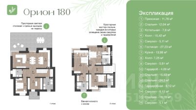 Планировка: 4 изолированные спальни (у каждой свой санузел и гардероб) гостиная-кухня 27+14 м², котельная, 2 холла.