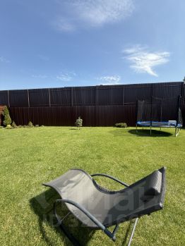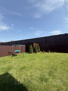 Участок прямоугольный, по периметру огорожен забором, ухоженный, красивый газон, плодовые деревья и кустарники, декоративные кустарники, туи, бытовка, площадка для машин, автоматические ворота, для входа Калитка/ дверь основная, видеозвонок/видеонаблюдение.