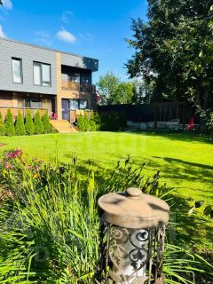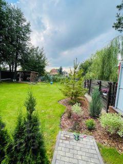 Участок в 10 соток благоустроен: выполнено ландшафтное проектирование с декоративной подсветкой, высажены кустарники и сохранены взрослые деревья, в дальней части обустроена зона барбекю.