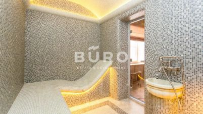 На обширном участке, помимо основного дома, возведен гостевой дом со СПА-комплексом (80 м²). Планировка гостевого дома включает: комнату для персонала, котельную, закрытую круглогодичного веранду с барбекю, СПА-зону с хаммамом, комнатой отдыха и санузлом.