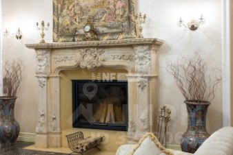 Панорамное остекление открывает вид на террасу и участок, за счёт чего гостиная всегда наполнена светом. Стены покрыты декоративной штукатуркой светло-бежевого оттенка, в тон подобраны мебель и камин из травертина. Фрески выполнены профессиональным художником.