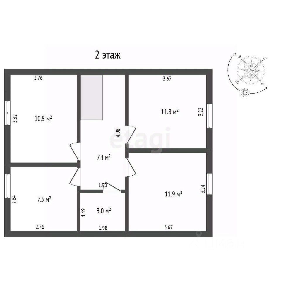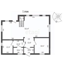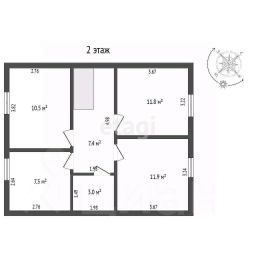 Первый этаж: просторная кухня-гостиная 32,2 м², спальня 8 м², бойлерная 2 м², санузел с душевой кабиной 4,2 м².Второй этаж: три спальни (10,5 м², 7,3 м², 11,8 м²), гардеробная 11,9 м², санузел 3 м².