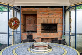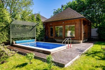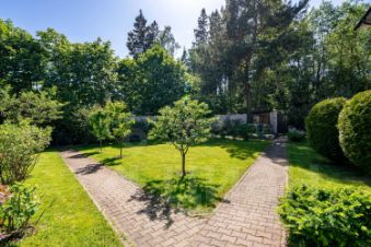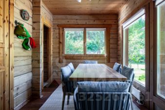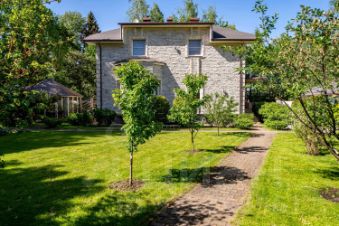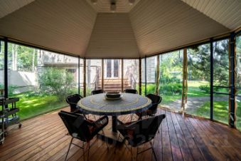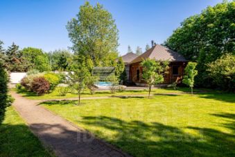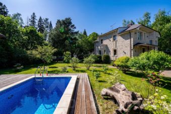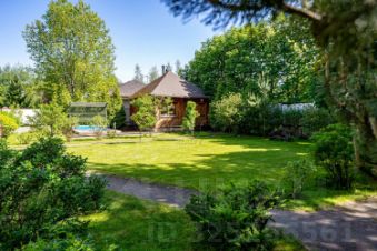 На участке высажены лиственные и хвойные деревья, баня на дровах с комнатой отдыха, гостевой дом для персонала, а также есть открытый бассейн.