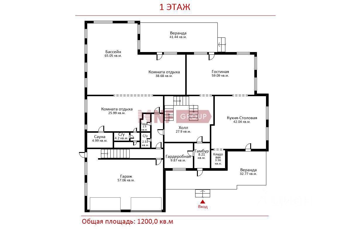 1 этаж: гардеробная, гараж на 2 м/м с квартирой для персонала (с/у, кухня, 3 комнаты), гостевой с/у, SPA-зона: купель, сауна, хамам, с/у, бассейн, зона отдыха с выходом на террасу, гостиная с выходом на террасу, кухня-столовая, лифт.