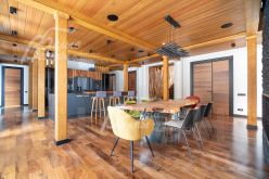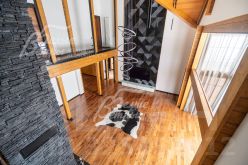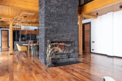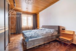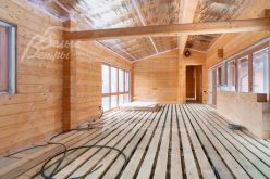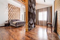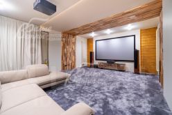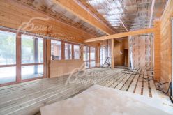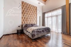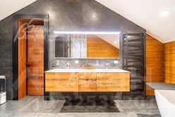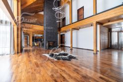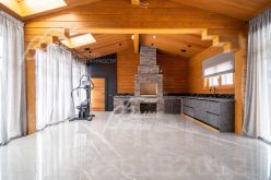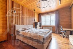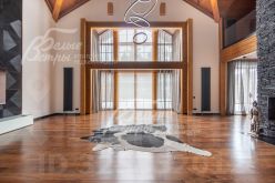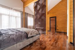Описание внутренней отделки: пространство дома оформлено в современной эстетике. Внутренняя отделка стен сочетает дерево и краску, панно из ценных пород создают выразительные акценты в лестничном холле и кинозале. Полы выложены итальянским керамогранитом с индивидуальным подбором рисунка и массивом американского ореха. Потолки комбинированные: дерево и гипсокартон. Установлены деревянные подоконники и дорогостоящие межкомнатные двери Union скрытого монтажа (высота 2,35 м) с вставками из ценных пород дерева. На второй этаж ведет лестница из массива дуба.