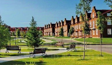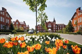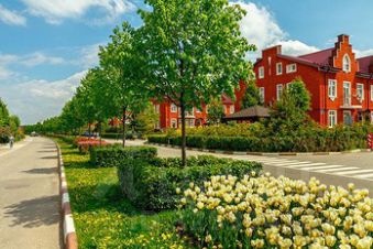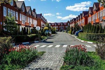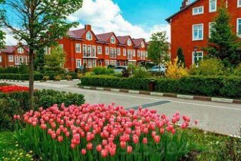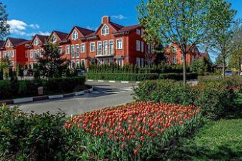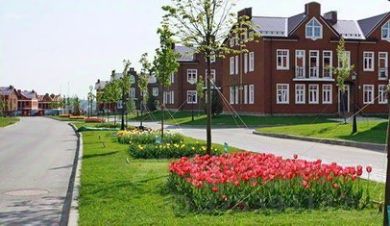 Два парковочных места перед входом и небольшая лужайкаКоттеджный посёлок Кембридж расположен в 24 км от МКАД по Новорижскому шоссе.