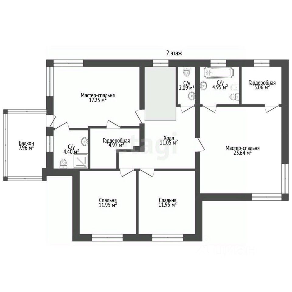 Планировка отличается рациональностью: на первом этаже размещены просторная кухня-гостиная, спальня и санузел; второй этаж занимают две мастер-спальни со своими санузлами и две гостевые комнаты с общим санузлом. Понарамные окна.