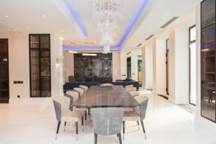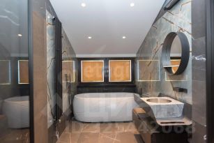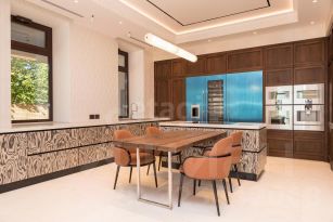 Техническое оснащение включает системы климат-контроля, приточной вентиляции, очистки воздуха и комплекс безопасности с видеонаблюдением. Планировка функционально зонирована. Цокольный уровень площадью 493 м² отведен под рекреацию и wellness-зону: здесь расположены домашний кинотеатр, бильярдная, сауна, хаммам и кальянная. На первом этаже (387 м²) находится гостиная с камином, объединенная с кухней, выходом на террасу и гостовая комната с санузлом. Второй этаж (293 м²) занимают две спальни с индивидуальными санузлами, кабинет и игровая. На третьем уровне обустроена изолированная зона с гостиной, кухней, спальней и мансардой, идеальная для членов семьи или гостей. Отдельный блок для персонала с собственным входом дополняет инфраструктуру.