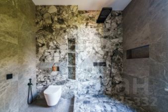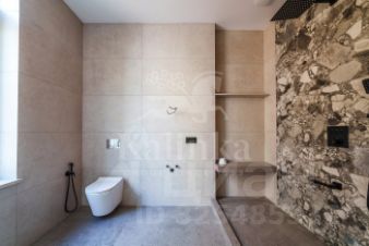 В отделке использованы высококачественные натуральные материалы, панорамные окна, высота потолков составляет 3,6 метра, балкон на втором этаже снабжен перилами из закаленного стекла. Эксплуатируемая кровля позволяет организовать дополнительное пространство для отдыха и наслаждаться прекрасным видом на поселок.