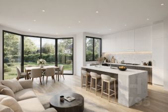 — кухня-гостиная с эркером и большим окном с видом во двор