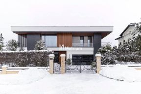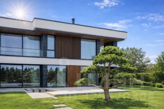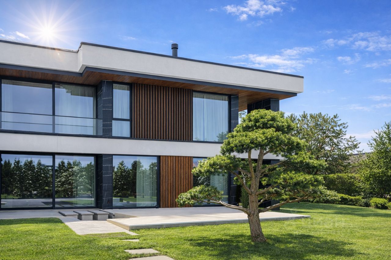 Фасад облицован крупноформатным керамогранитом, лиственницей и сланцем. Панорамное остекление из алюминия Alutech.