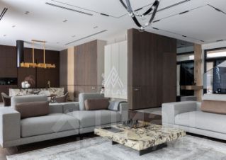 Во внутренней отделке использованы премиальные материалы (травертин, мрамор, крупноформатный керамогранит (Italon, Atlas Concord, Rex), декоративные панели из дуба, дубовый шпон, декоративная итальянская штукатурка Arreghini), двери скрытого монтажа c алюминиевым профилем. Встроенная бытовая техника Miele. Сантехника итальянских и испанских брендов. Трехсторонний камин Piazzetta.