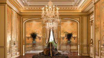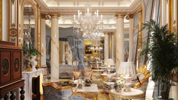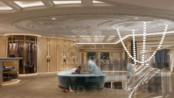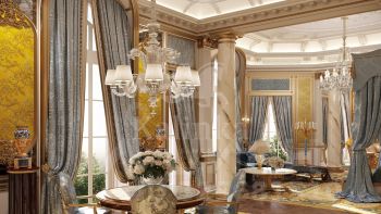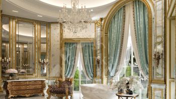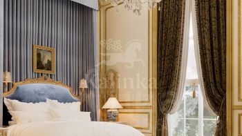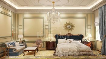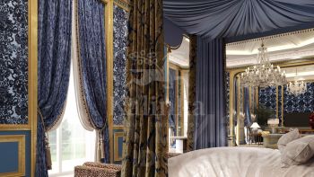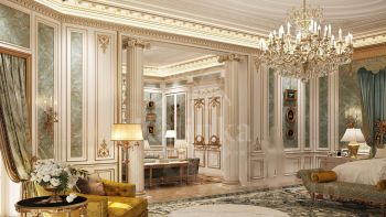 1 этаж: холл, каминная, гостиная, столовая, кухня, гардеробная, помещение для хранения сумок и чемоданов, шубная комната, санузел, сейфовая комната, кабинет, детская спальня с санузлом и гардеробной, две гостевые спальни с санузлами и гардеробными, санузел, блок для персонала с тремя спальнями и санузлами, детская игровая комната.