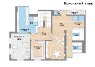 Цокольный этаж разделён на две зоны: SPA зона - сауна (установлено оборудование HARVIA, в том числе Звёздное небо), хаммам, душевые с обливным устройством финского производителя SAWO, комната отдыха с биокамином и роскошной итальянской люстрой, санузел. Технологическая часть: две комнаты свободного назначения с дневным освещением (спортивный зал, комната для персонала и тд.), прачечная, санузел.