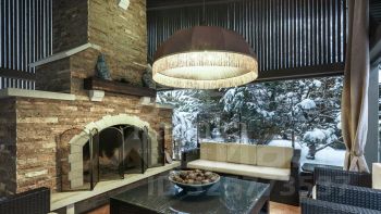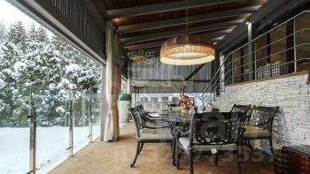 Патио: Большой уличный камин, стеклянное ограждение, клееный брус, ПВХ шторы на зиму, высокие потолки, пол и лестница клинкер, плетеная мебель.