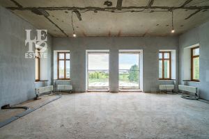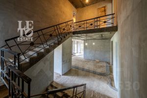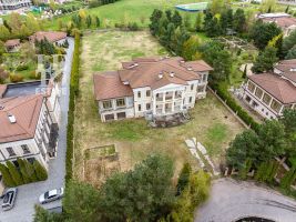На земельном участке есть дом в классическом стиле. Фасад дома без отделки, внутри проведены работы по выравниванию стен, разведена электрическая проводка. Дом отапливается. Фундамент монолитная плита, стены кирпичные, лестница монолитная. Цоколь сухой, вокруг дома сделан дренаж. Вода отводится в ливневую канализацию. Есть проектная и рабочая документации по внутренним строительным работам. Два соседа - слева и справа, живут постоянно.