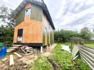 Дом каркасный, фундамент свайный. Огорожен забором.