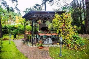 На участке вековые хвойные деревья, ландшафтный дизайн, дорожки , освещение.